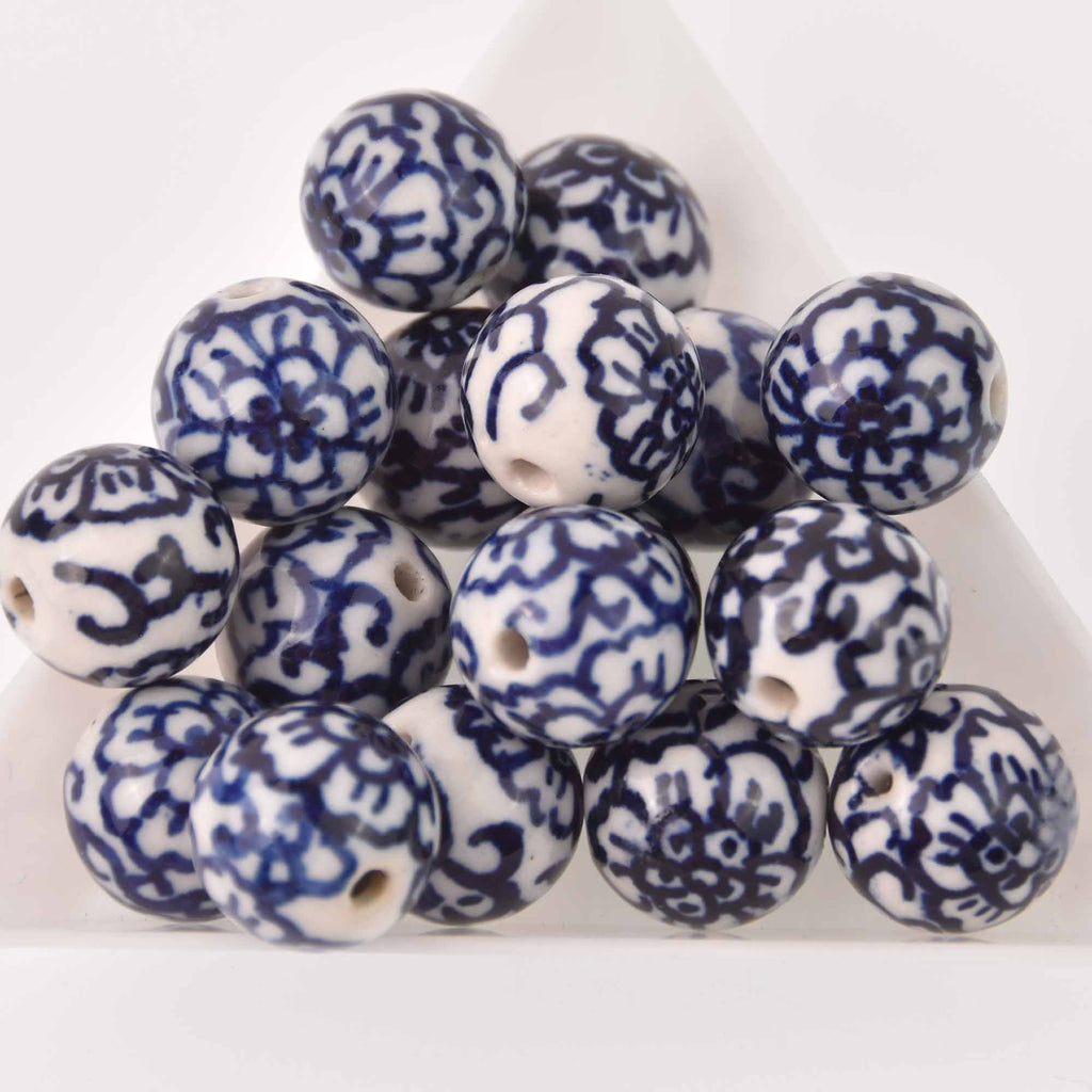 12mm Round Porcelain Beads, Dark Blue, Flower, 6 beads, bgl2057