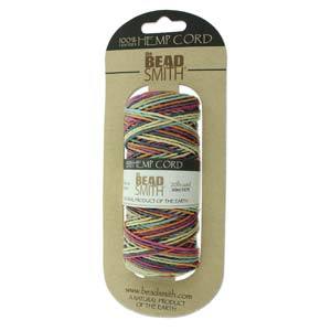 Natural hemp cord, dyed a variegated rainbow pattern.