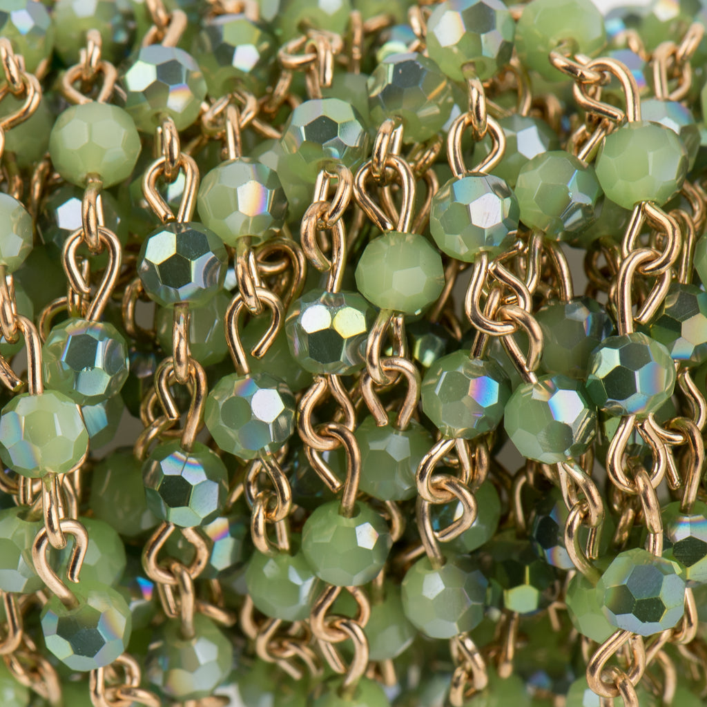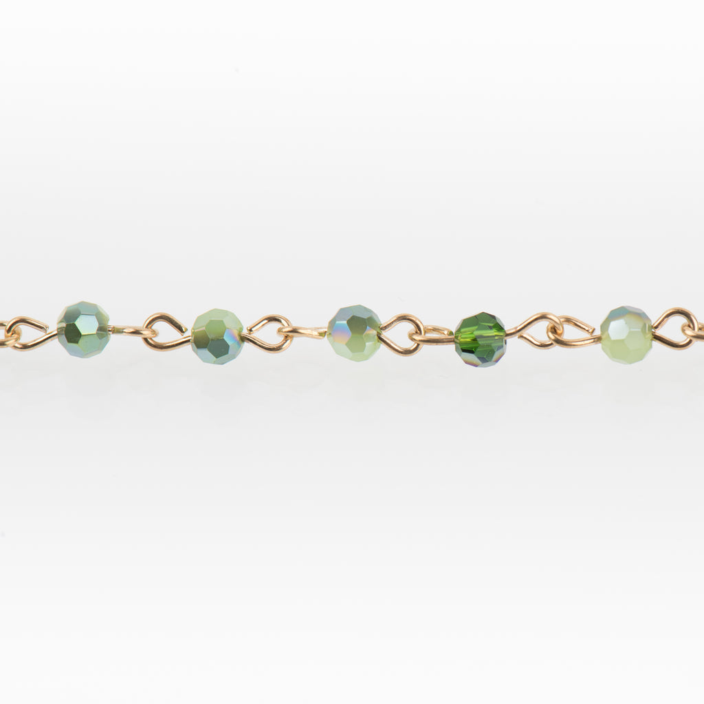 1 yard of grass green crystal rosary chain with 4mm crystals. Each crystal is hand-looped with sturdy gold wire.