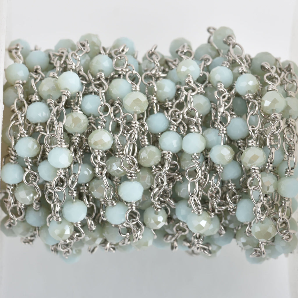 1 yard LIGHT BLUE Crystal Rosary Bead Chain, half plated beads, silver double wrapped wire, 4mm faceted rondelle glass beads, fch0764a