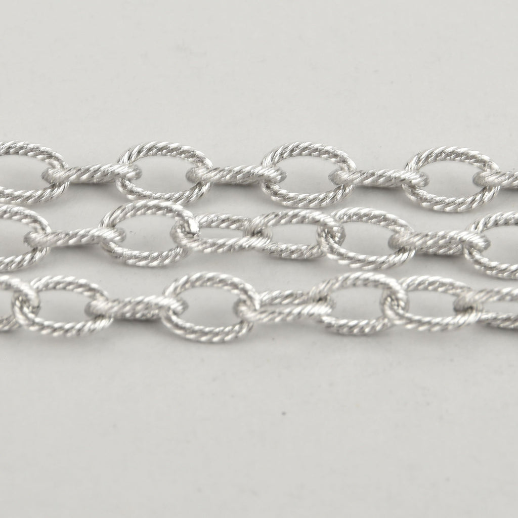 Oval cable link chain, silver tone metal. Twisted rope design gives this chain a nice texture.