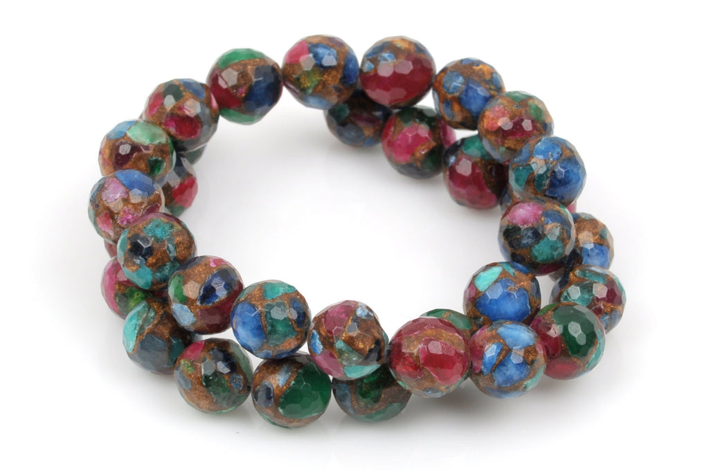 Gorgeous emerald green, royal blue, and ruby red composite and golden quartz round faceted beads! Lots of sparkly gold matrix marbled throughout each bead.