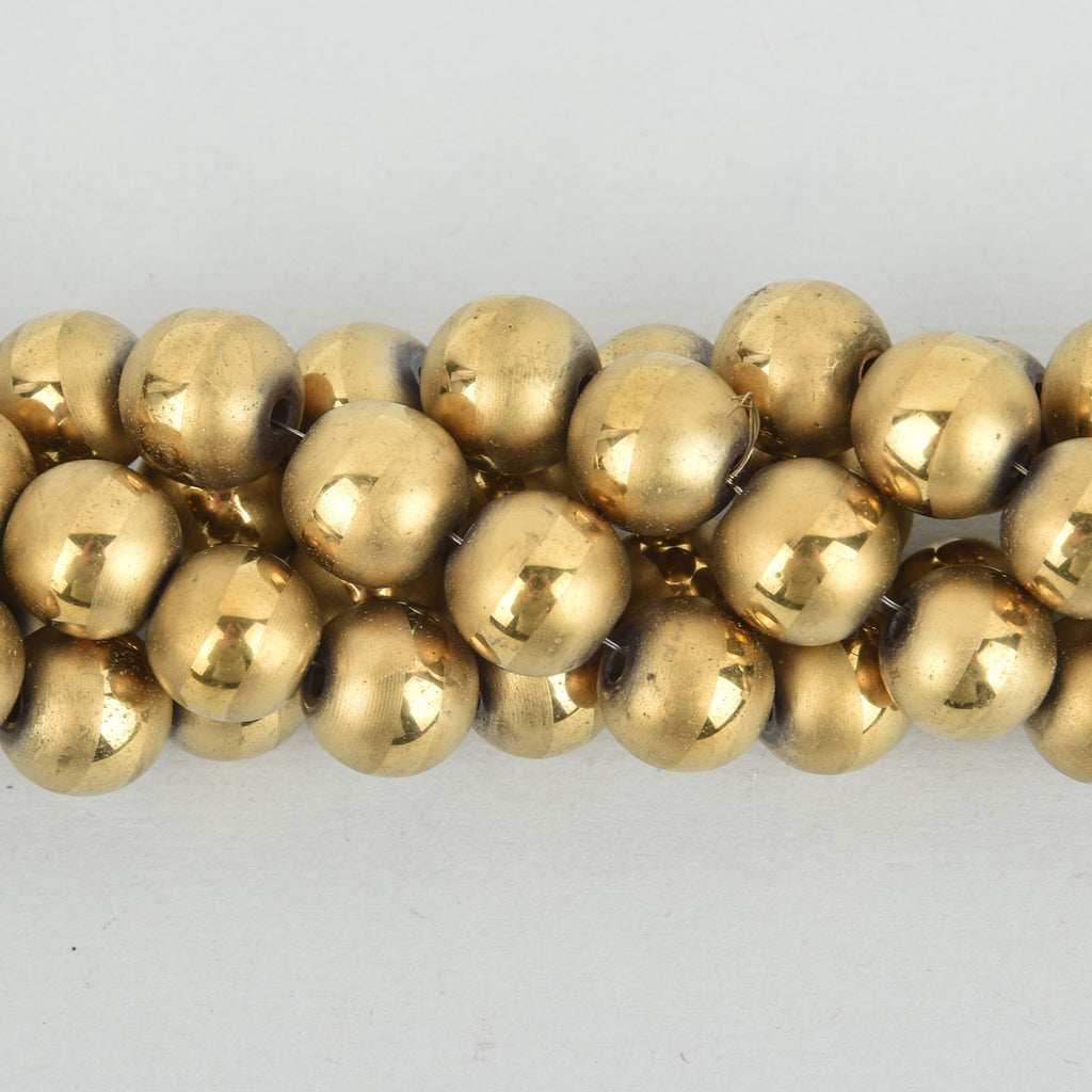 Smooth (non-faceted) round hematite beads with a titanium coating; plated with a shiny gold finish.