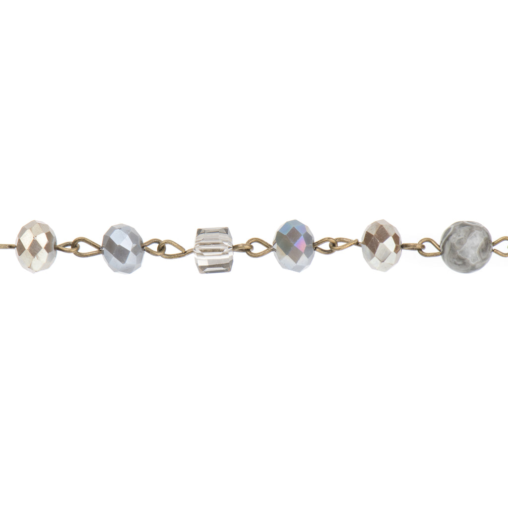 The chain is mixed with different types of stones ... 8mm natural grey picture jasper, 8mm metallic taupe crystal rondelles, 8mm grey AB crystal rondelles, 6mm crystal cubes.
