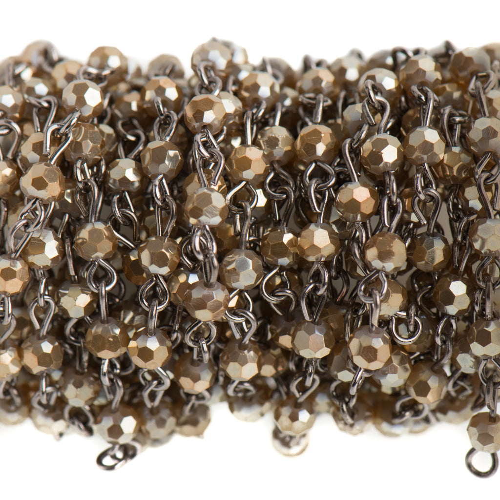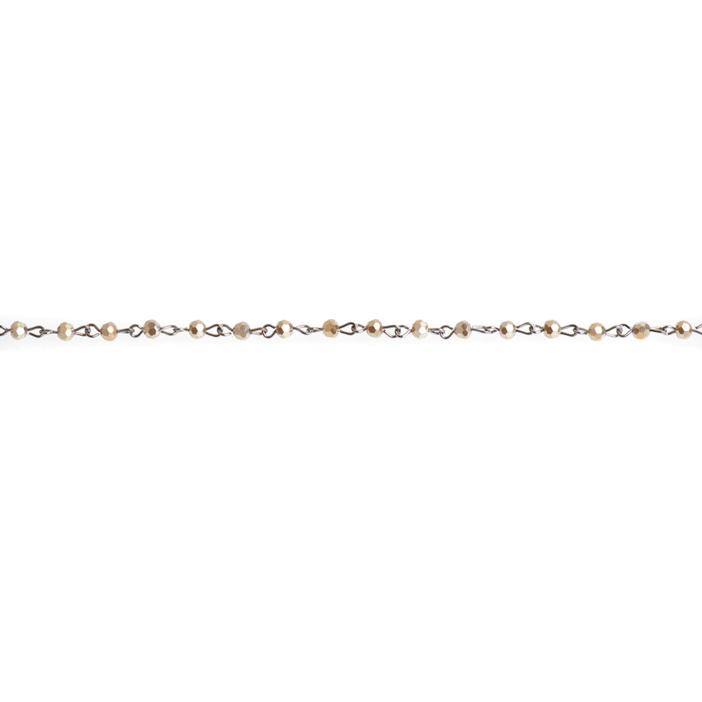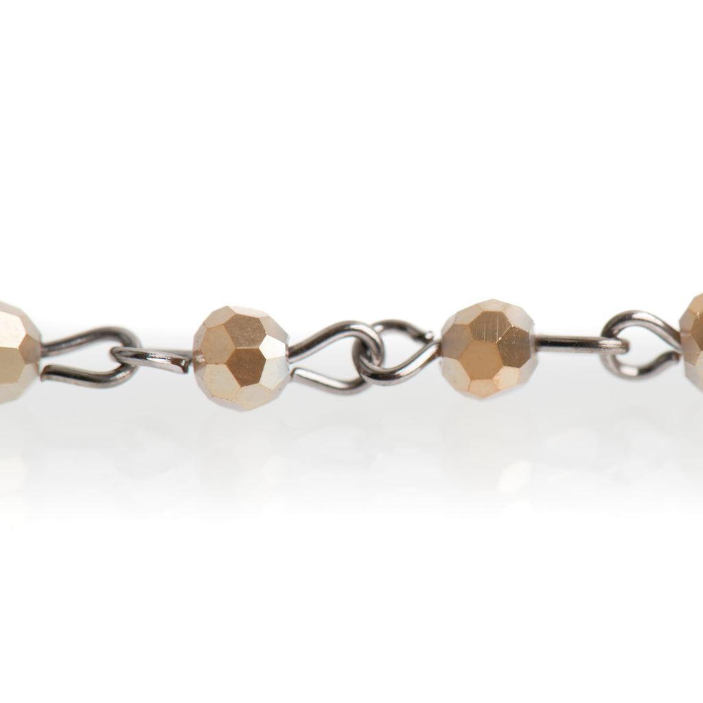 Crystal glass rosary chain with 4mm round beads. Each crystal is hand-looped with sturdy gunmetal wire.