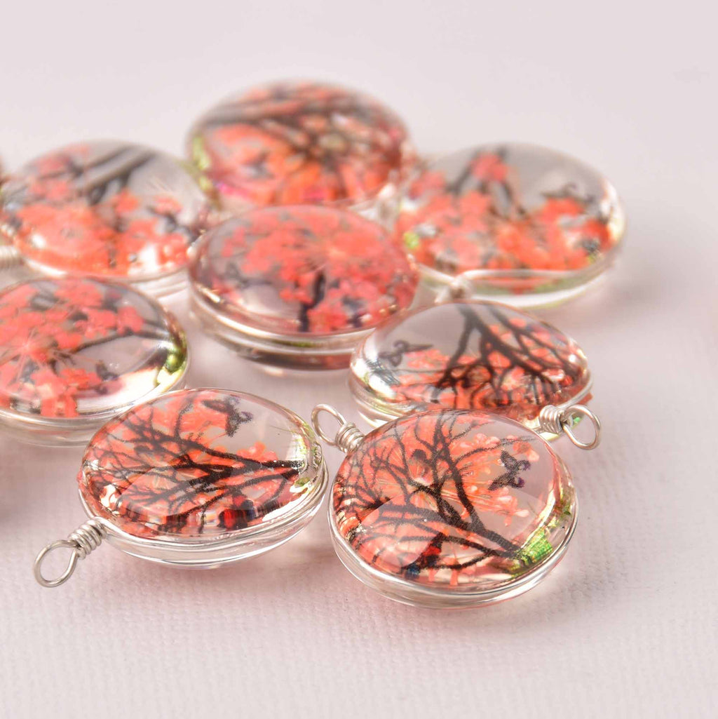 Pretty flowers are dried and pressed between two glass dome cabochons, which are hand-painted with the outline of a tree and butterflies. It's then wrapped with a silver loop bail. These are beautiful and reminiscent of cherry blossom trees!