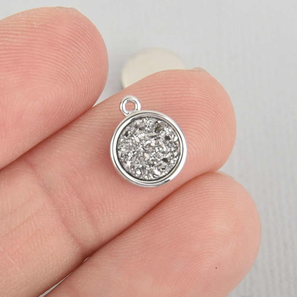 Gorgeous luxury charms showcasing natural gemstone druzy stones with a sparkly finish on the front.