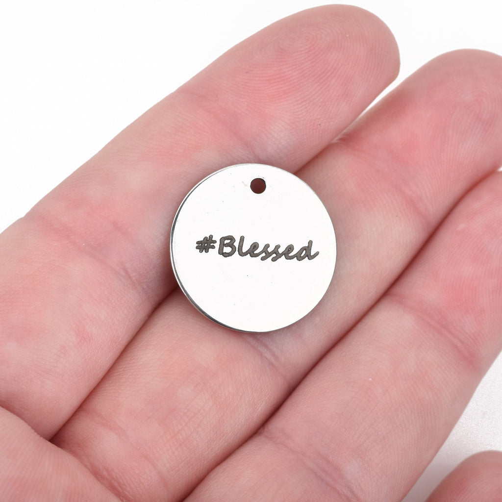 Stainless steel charms with "#Blessed" laser engraved, exclusively designed and lasered by us right here in our studio Texas, USA.