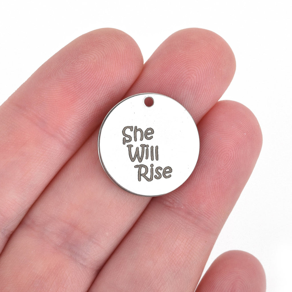 Stainless steel charms with "She Will Rise" laser engraved, exclusively designed and lasered by us right here in our studio Texas, USA.