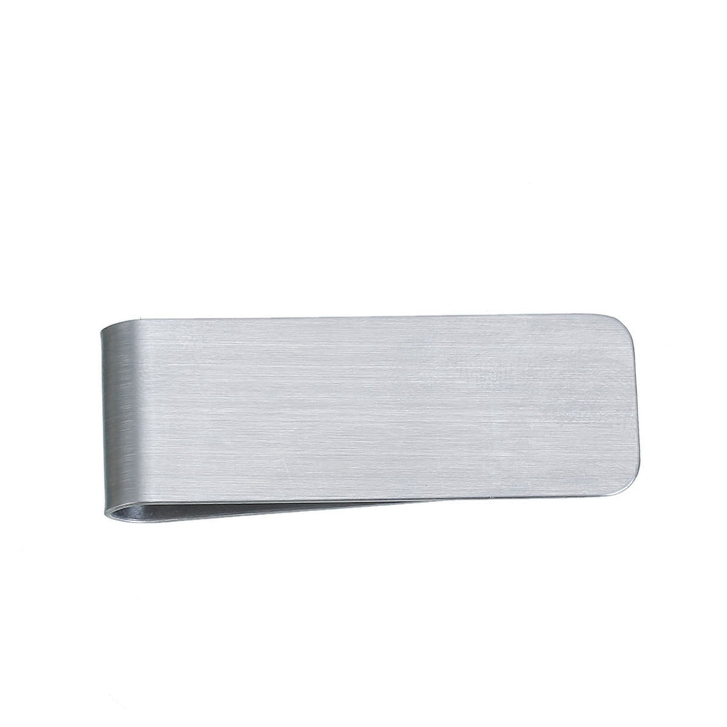 Stainless steel money clip blanks with a slightly brushed finish.
