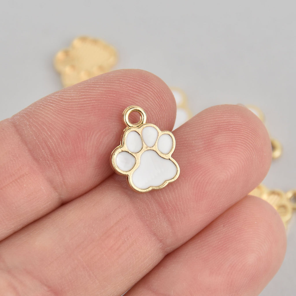 5 White Paw Print Charms, Gold with Enamel chs6865