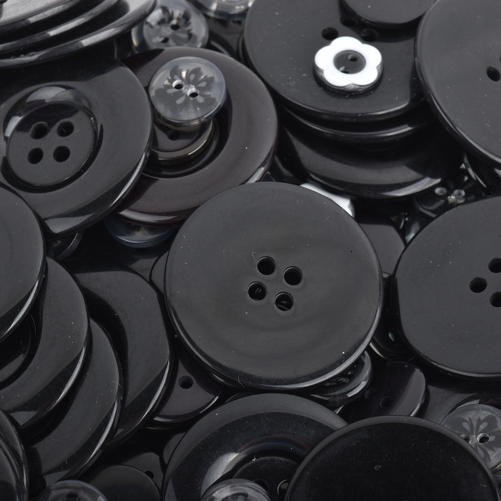 50 gram bag of BLACK plastic/resin buttons, mixed at random.