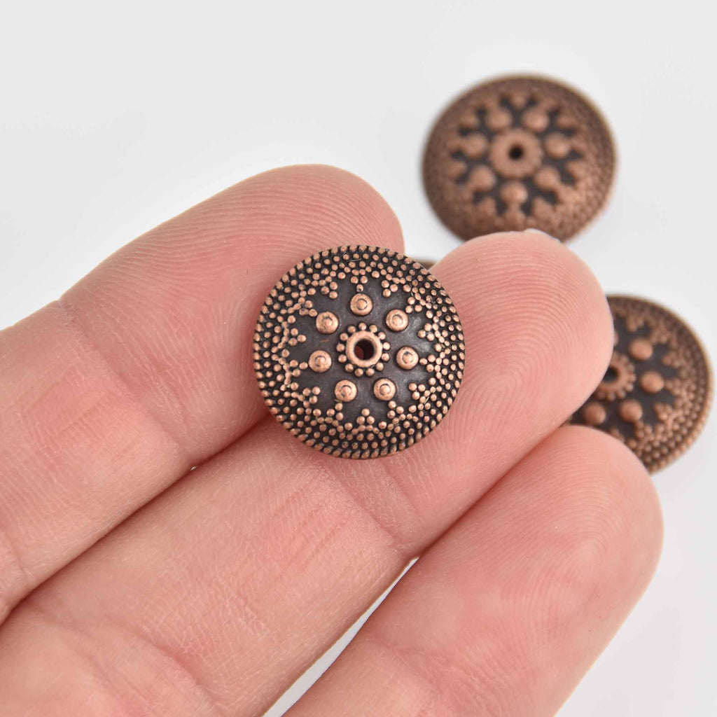 Antiqued copper puffed coin beads with mandala design carved in both sides.