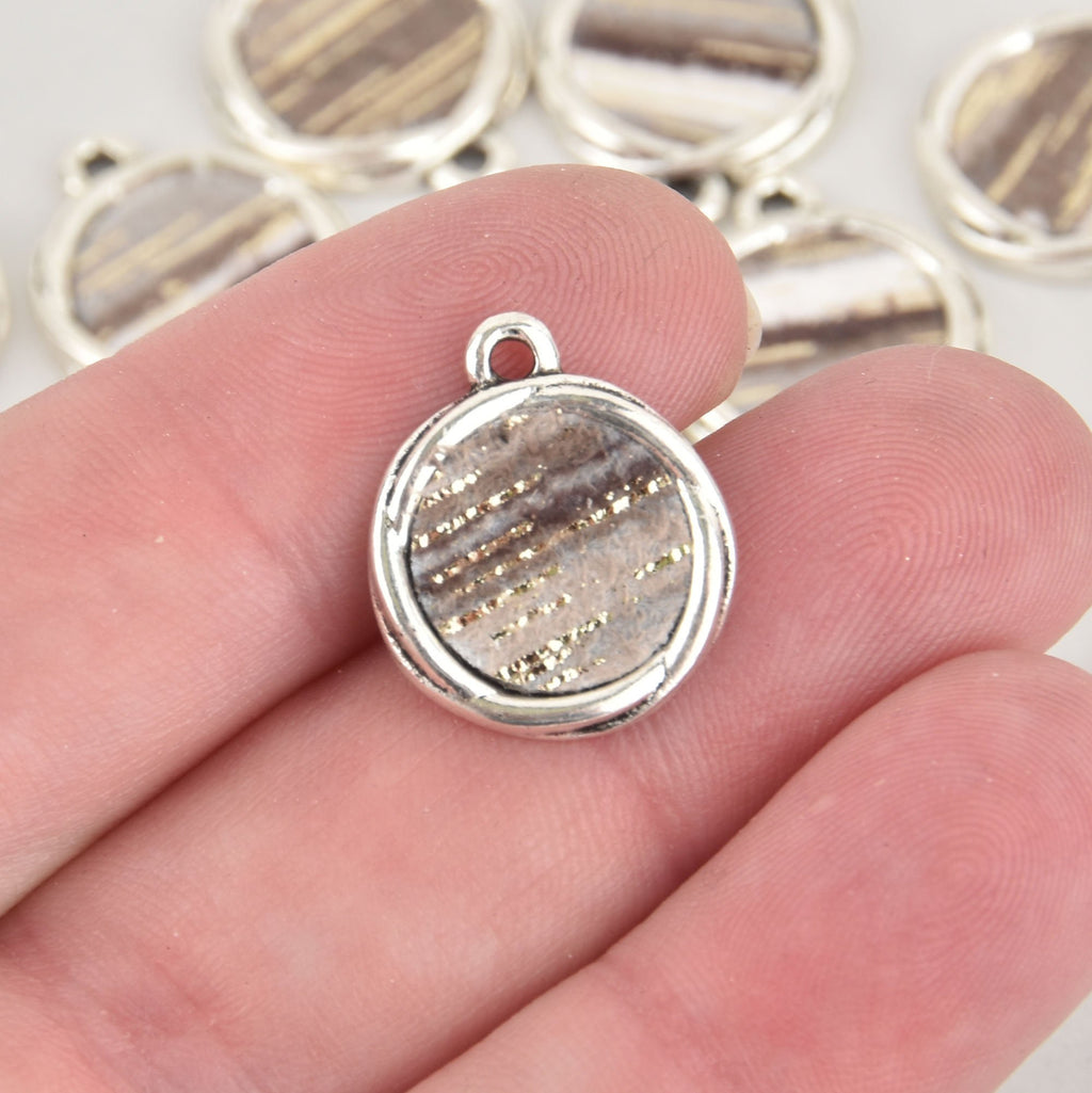 6 Fiber Drop Charms, Gray White Gold Fabric, Silver Plated, Threaded Round 16mm chs6769