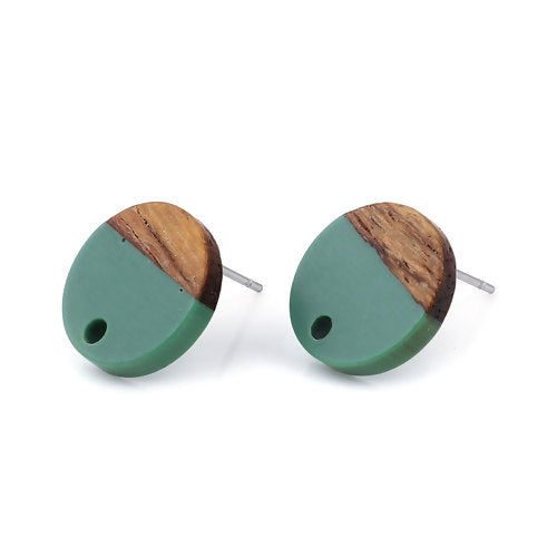 6 Resin and Wood Earring Post Blanks, Green, 14mm dia, fin1143