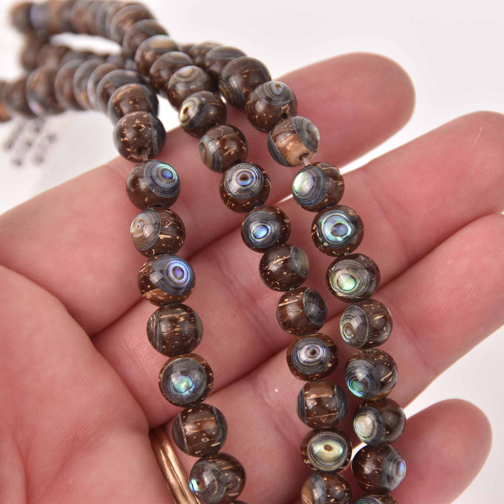 8mm Coconut Wood and Abalone Round Beads, wooden beads, shell beads, half strand, gem0805
