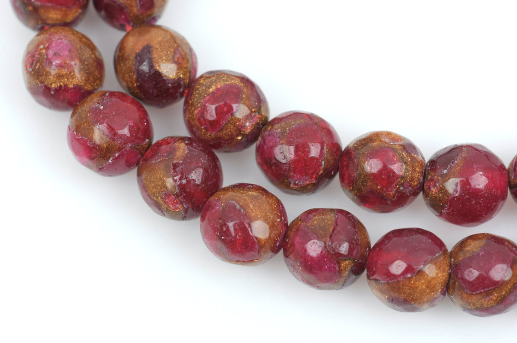 Gorgeous ruby red and golden quartz round faceted beads! Lots of sparkly gold matrix marbled throughout each bead.