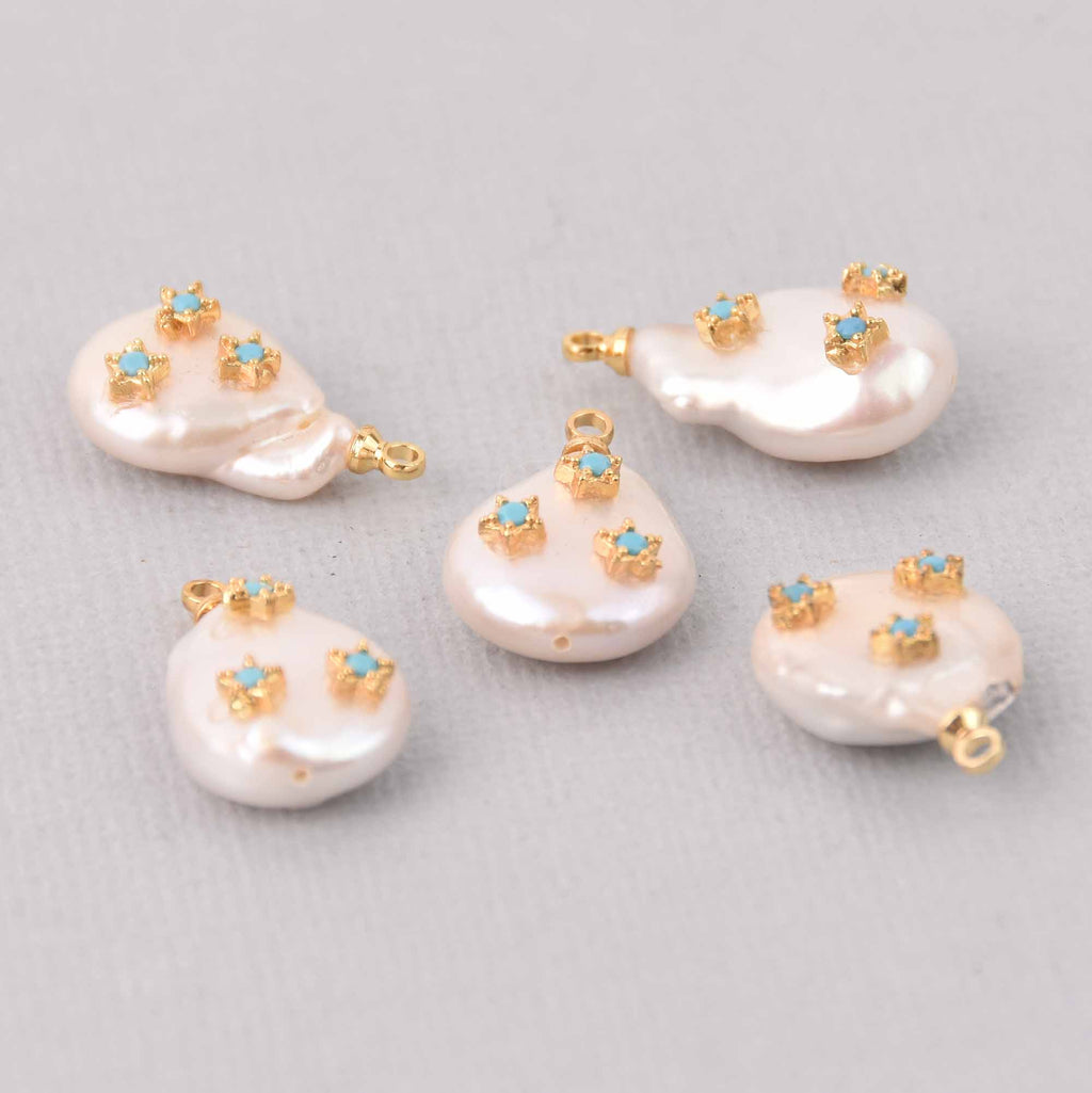 Real cultured button pearl with hand-set micro pave blue CZ crystals inset in gold plated trim with a gold plated bail.