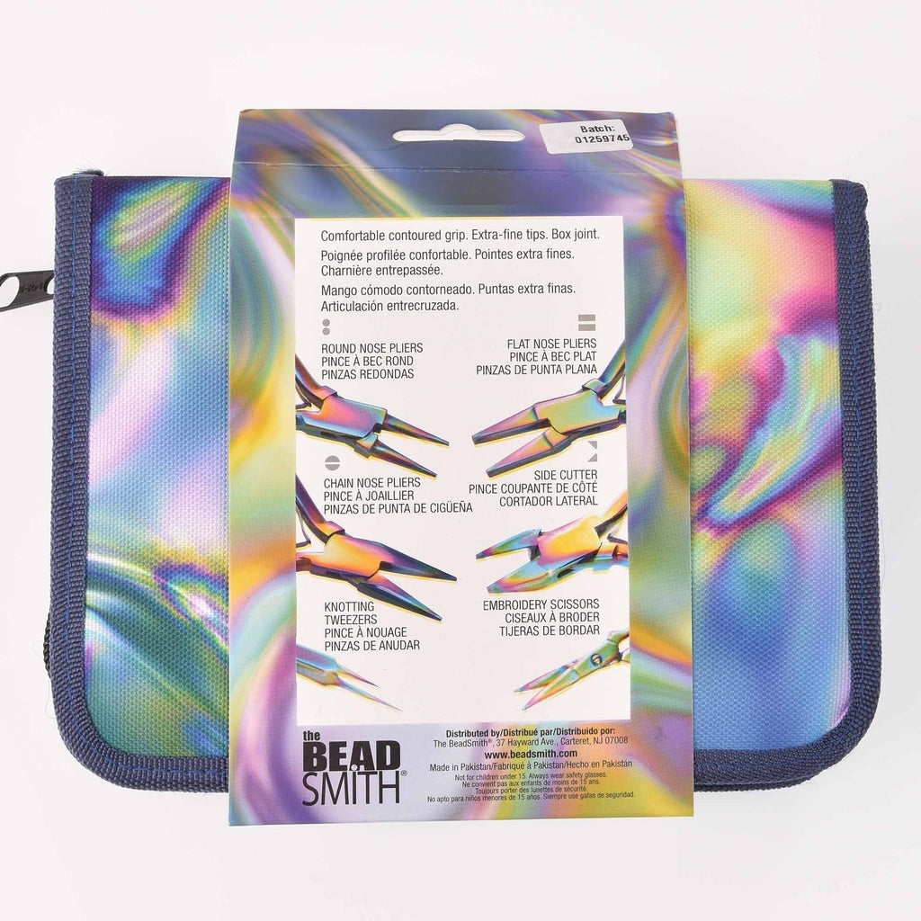 Each set contains the following tools: round nose pliers, flat nose pliers, chain nose pliers, side cutter, knotting tweezers, embroidery scissors, and a stylish rainbow zipper clutch.