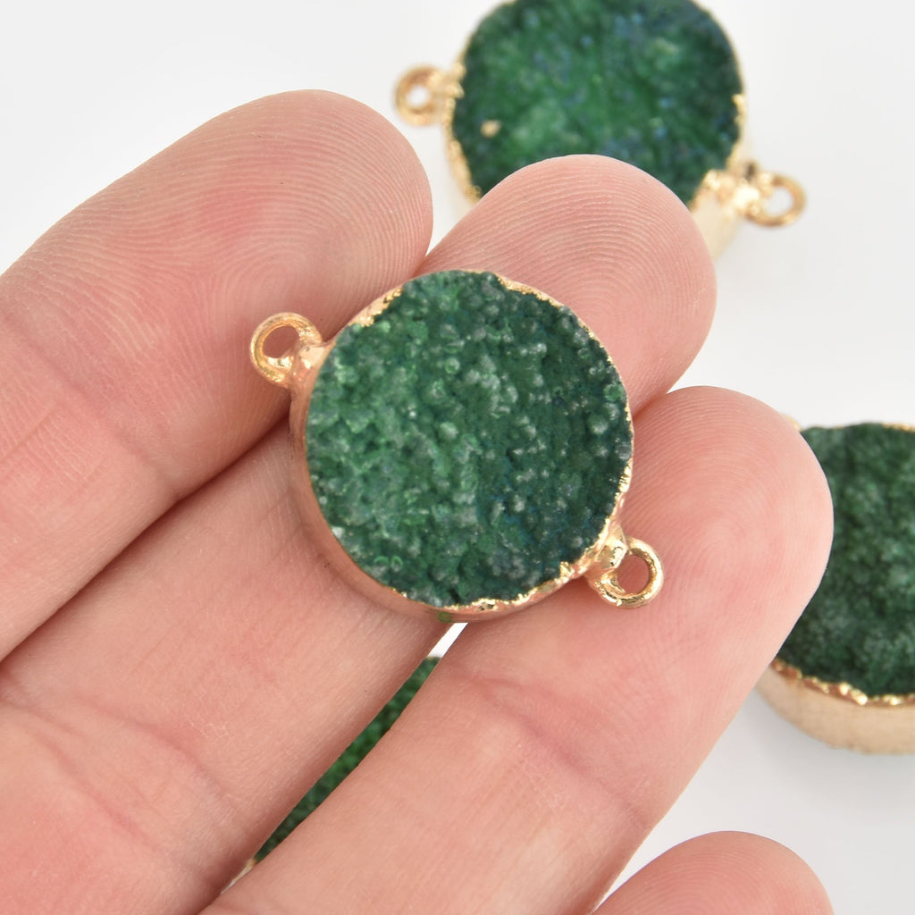 Stunning druzy gemstones! Various shades of emerald green set in a gold metal electroplate bezel. 2 loops on either side to use as a connector link (double bails).