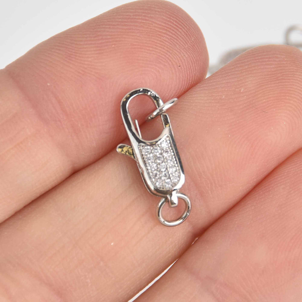Sparkly micro pave' lobster clasp with silver plating over brass.