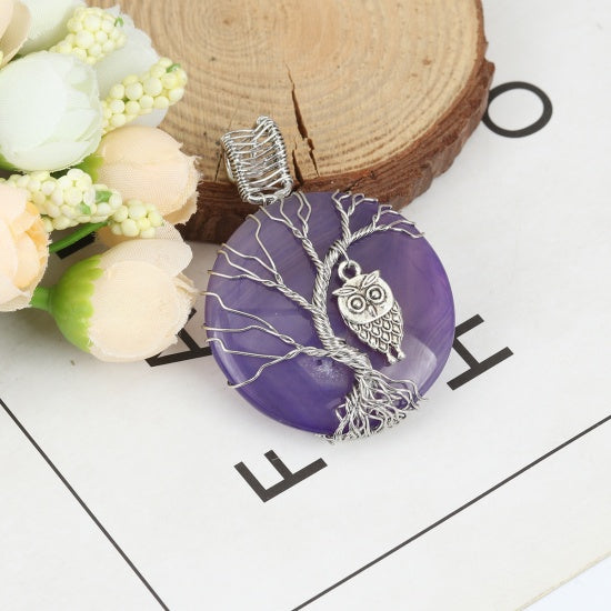 Handmade wire-wrapped tree and owl pendant with silver wire expertly wrapped around a polished agate gemstone.
