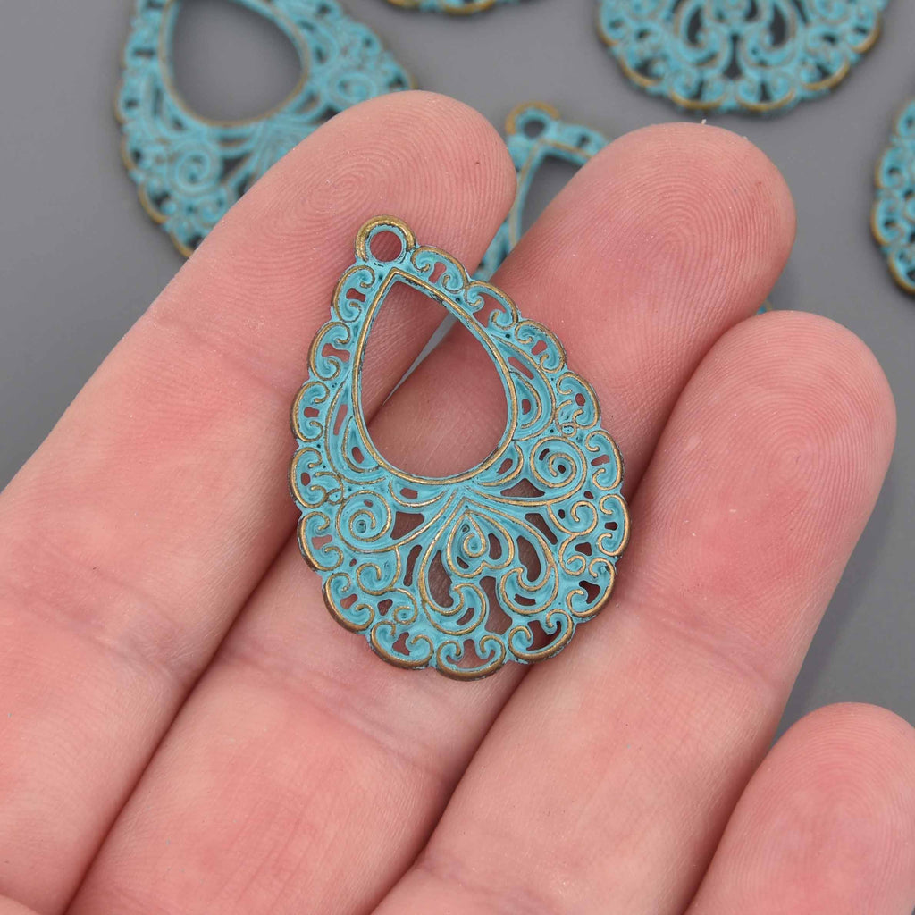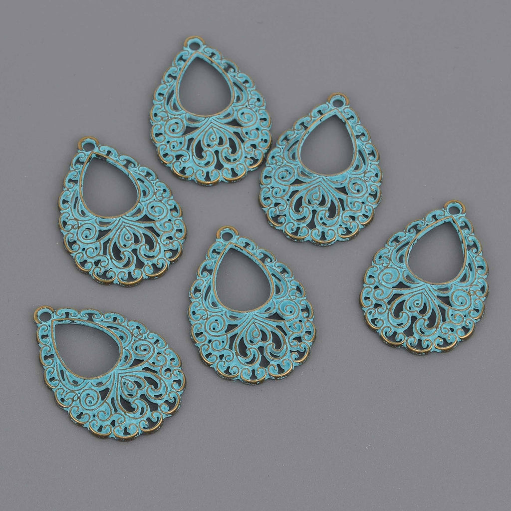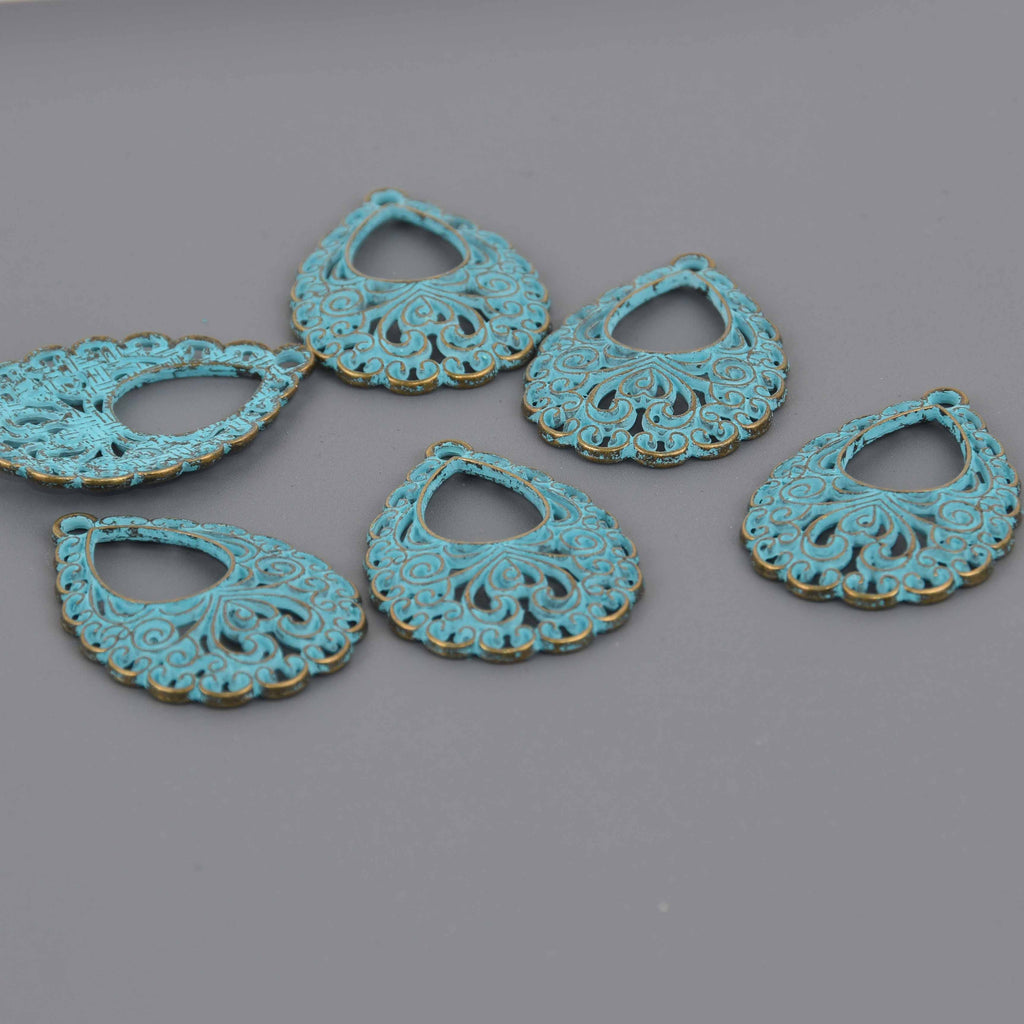 5 Bronze Patina Teardrop Charms, Blue Verdigris Patina, Victorian filigree design, chs8620