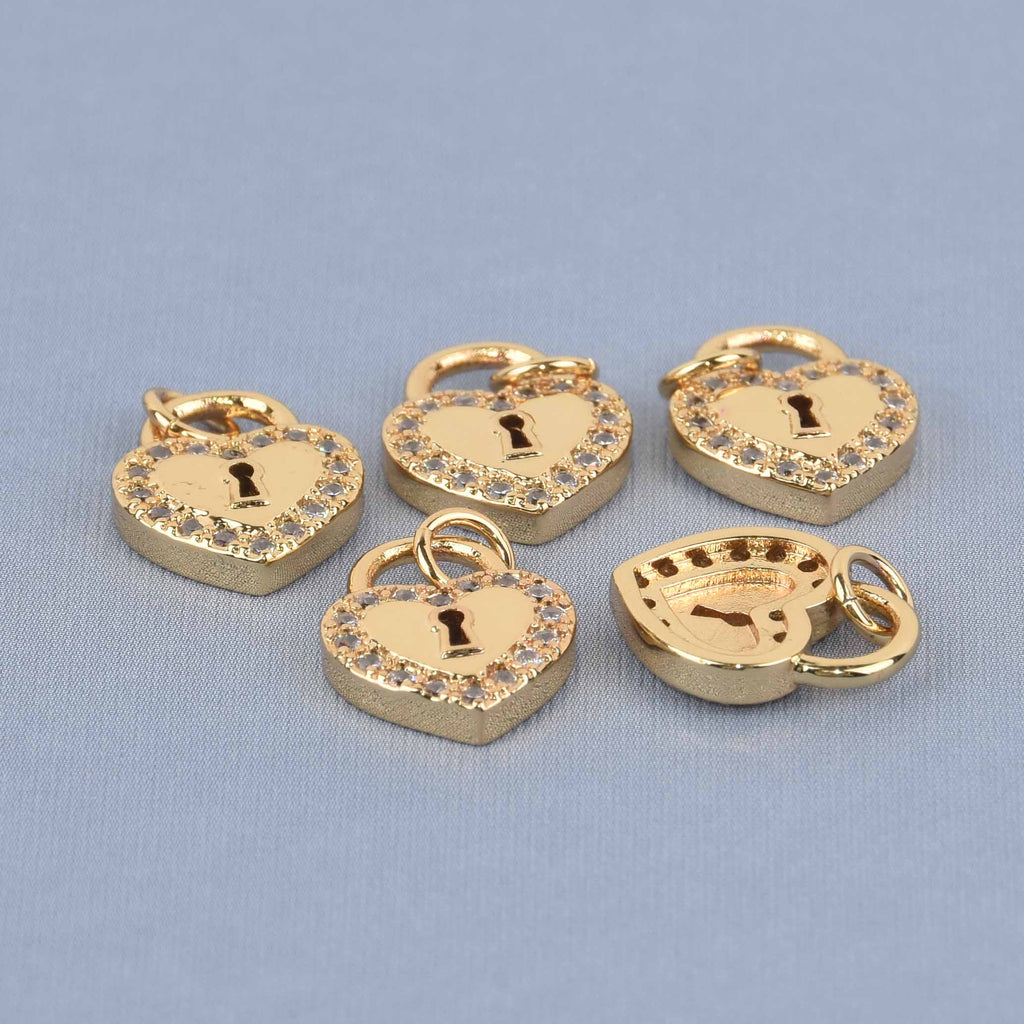 2 Gold Heart Lock Charms, Micro Pave, 12mm, chs8520