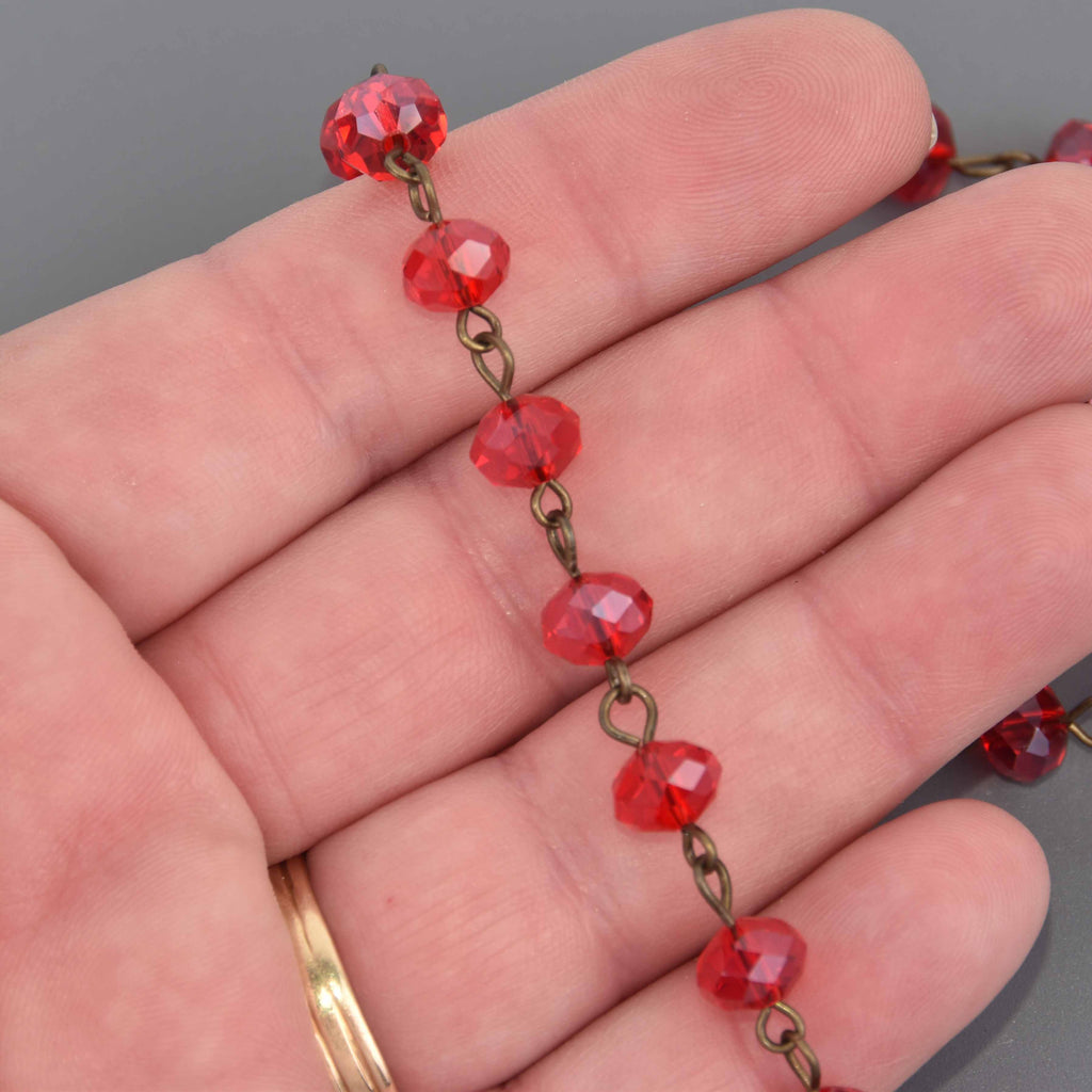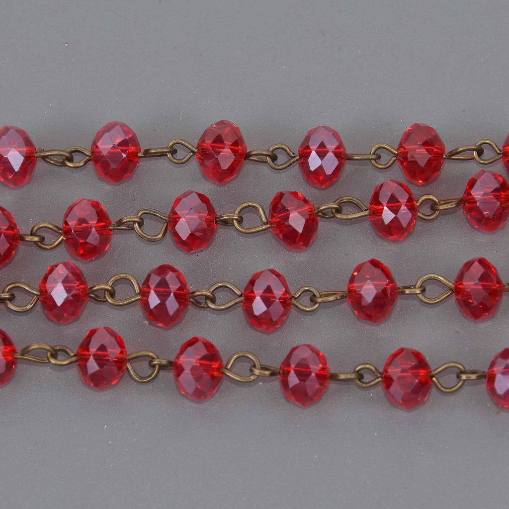 1 yard RED Crystal Rondelle Rosary Chain, bronze wire, 8mm faceted glass beads, fch1342a