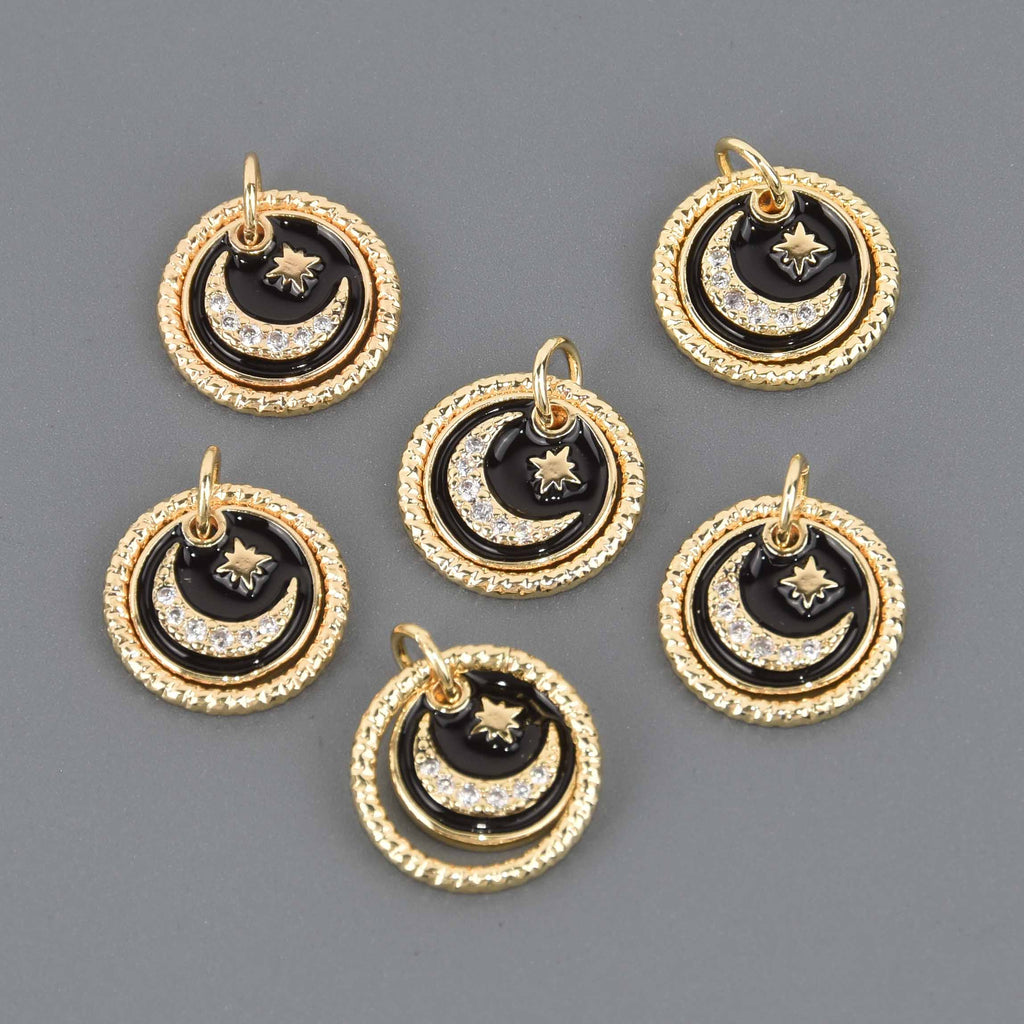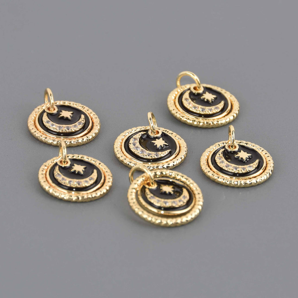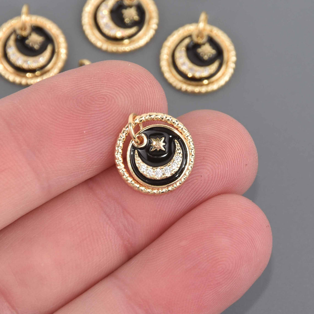 Gold plated dangle charms with a twisted gold rope ring around a 2nd inset charm that has black enamel, tiny crystals, and a star/moon motif.