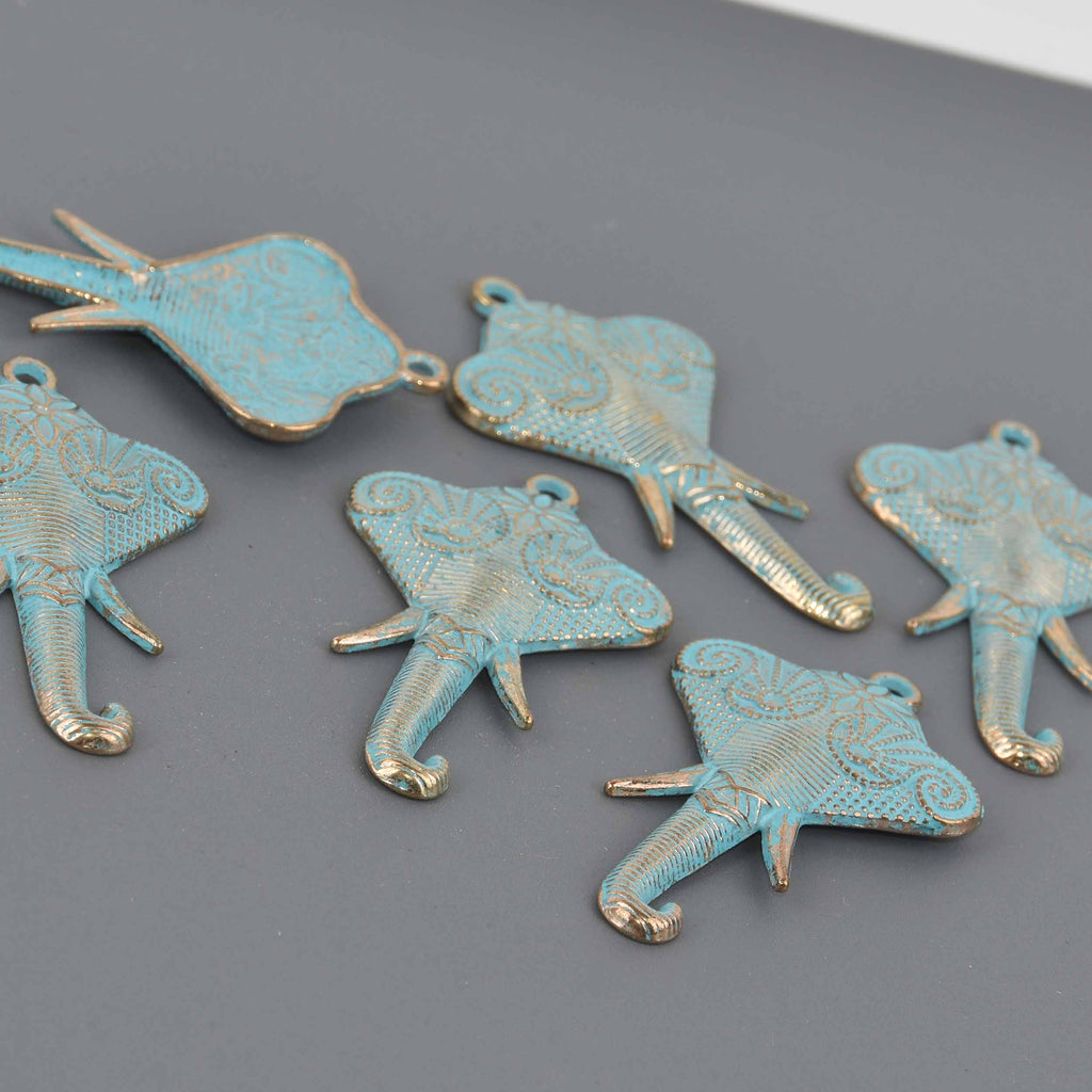 5 ELEPHANT Gold Pendant Charms, Light Gold with blue verdigris patina, Hindu Ganesha 1-3/4" long, chs8648