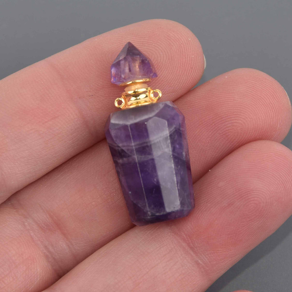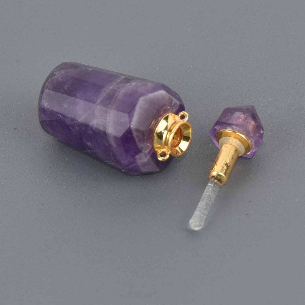 The gemstone top pops out to reveal a small vial that you can fill with essential oils, perfume, cremation ashes, etc. A tiny glass wand applicator is attached to the gemstone lid and tucked safely inside the bottle when closed.