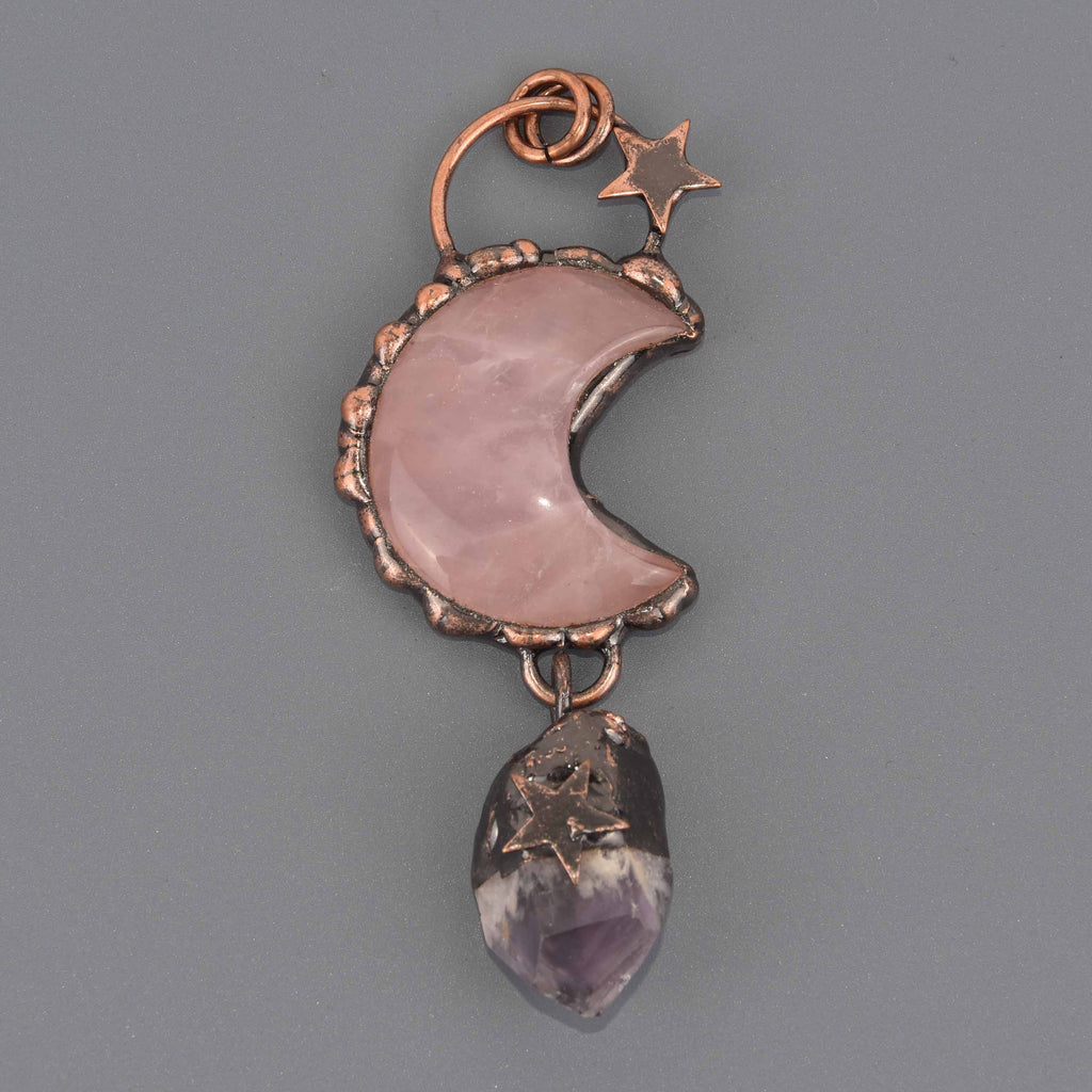 Copper Moon and Stars Gemstone Pendant with Amethyst and Rose Quartz, 3.5" long, chs8618