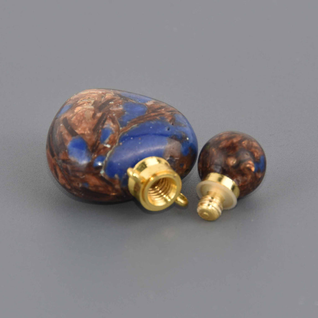 The gemstone top screws off to reveal a small vial that you can fill with essential oils, perfume, cremation ashes, etc.