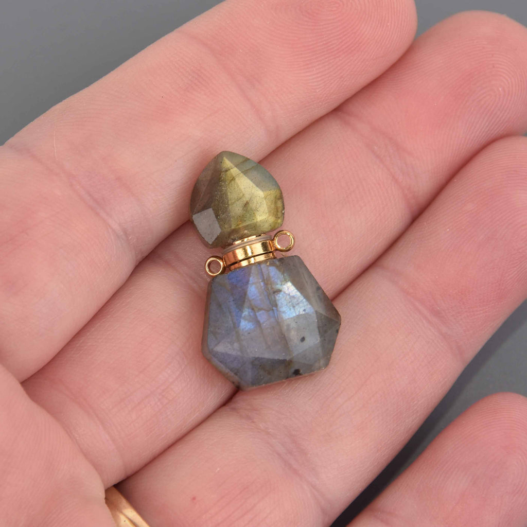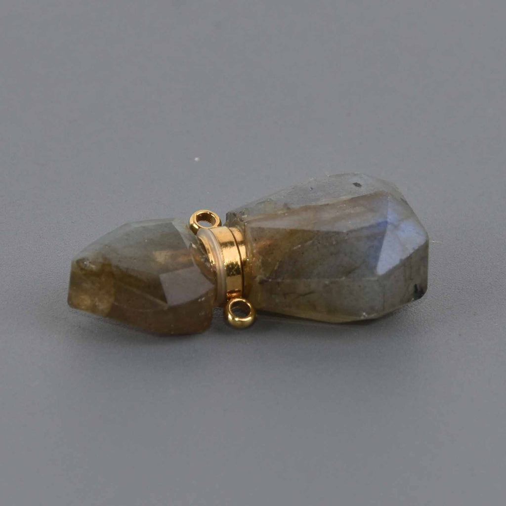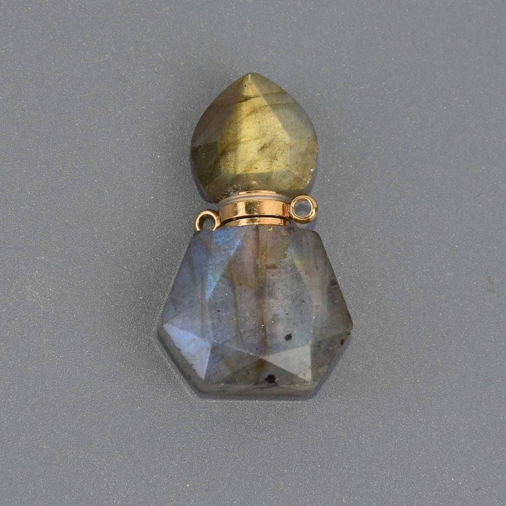 Labradorite Natural Crystal Essential Oil Bottle Pendant, Perfume Bottle, Gold Trim, chs8658