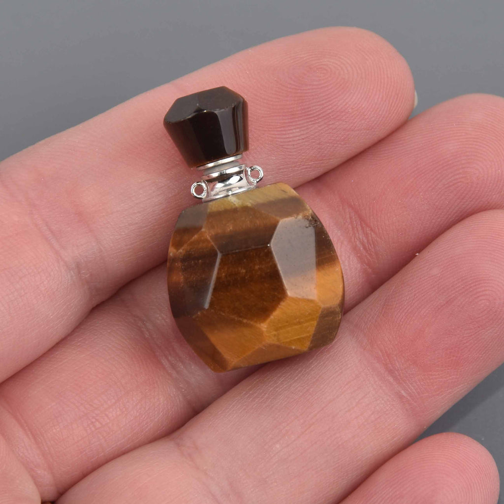 Tiger Eye Natural Crystal Essential Oil Bottle Pendant, Perfume Bottle, Silver Trim, chs8535