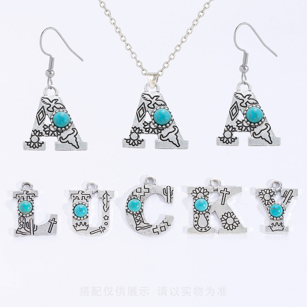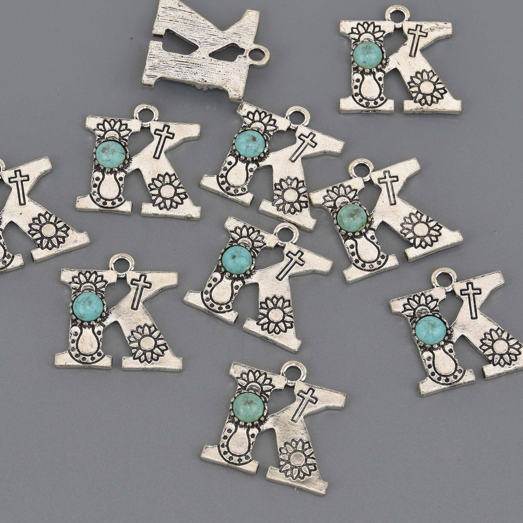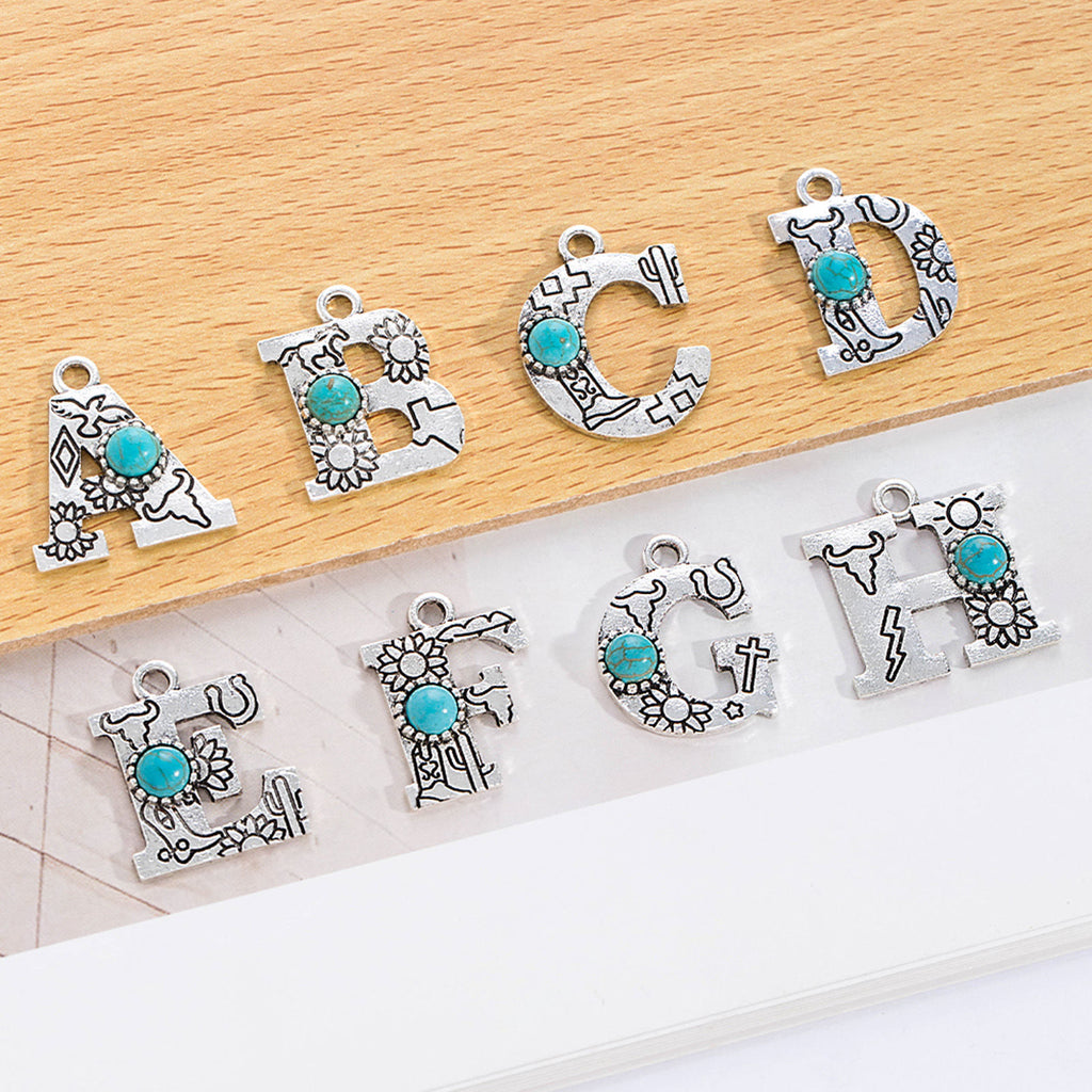 Add whimsical, boho-inspired flair to your DIY jewelry projects with these antique silver alphabet charms! Each charm features a capital letter design adorned with a cabochon in imitation turquoise — perfect for crafting personalized bracelets, necklaces, keychains, and more.