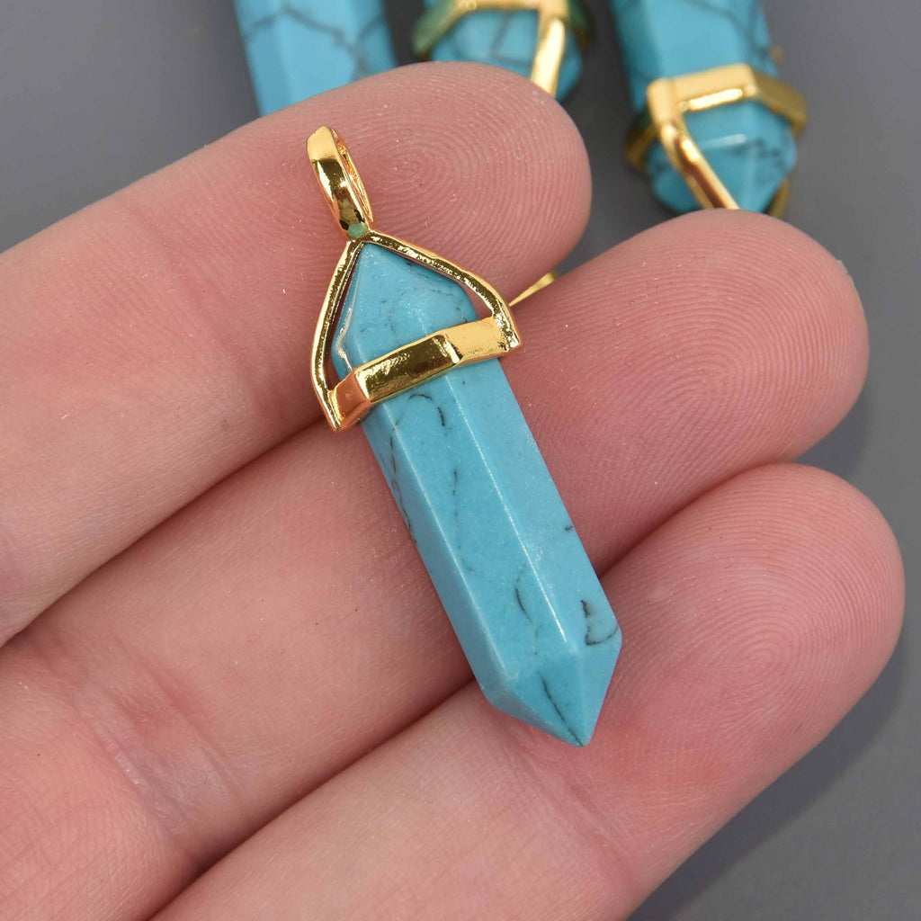 1 Turquoise Howlite Charm, Gemstone Point Pendant, gold trim, 1.5", chs8550
