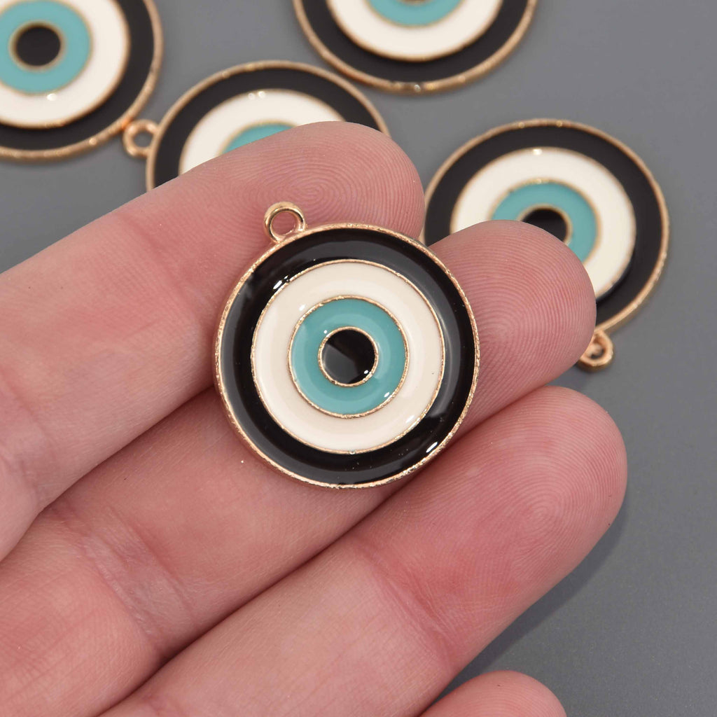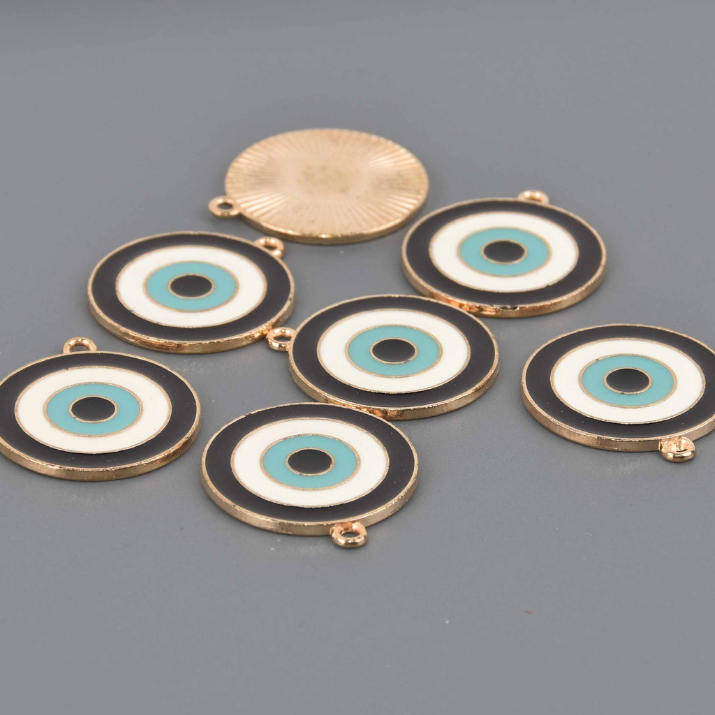 These gold plated evil eye charms have beautiful enamel embedded in a circle design.