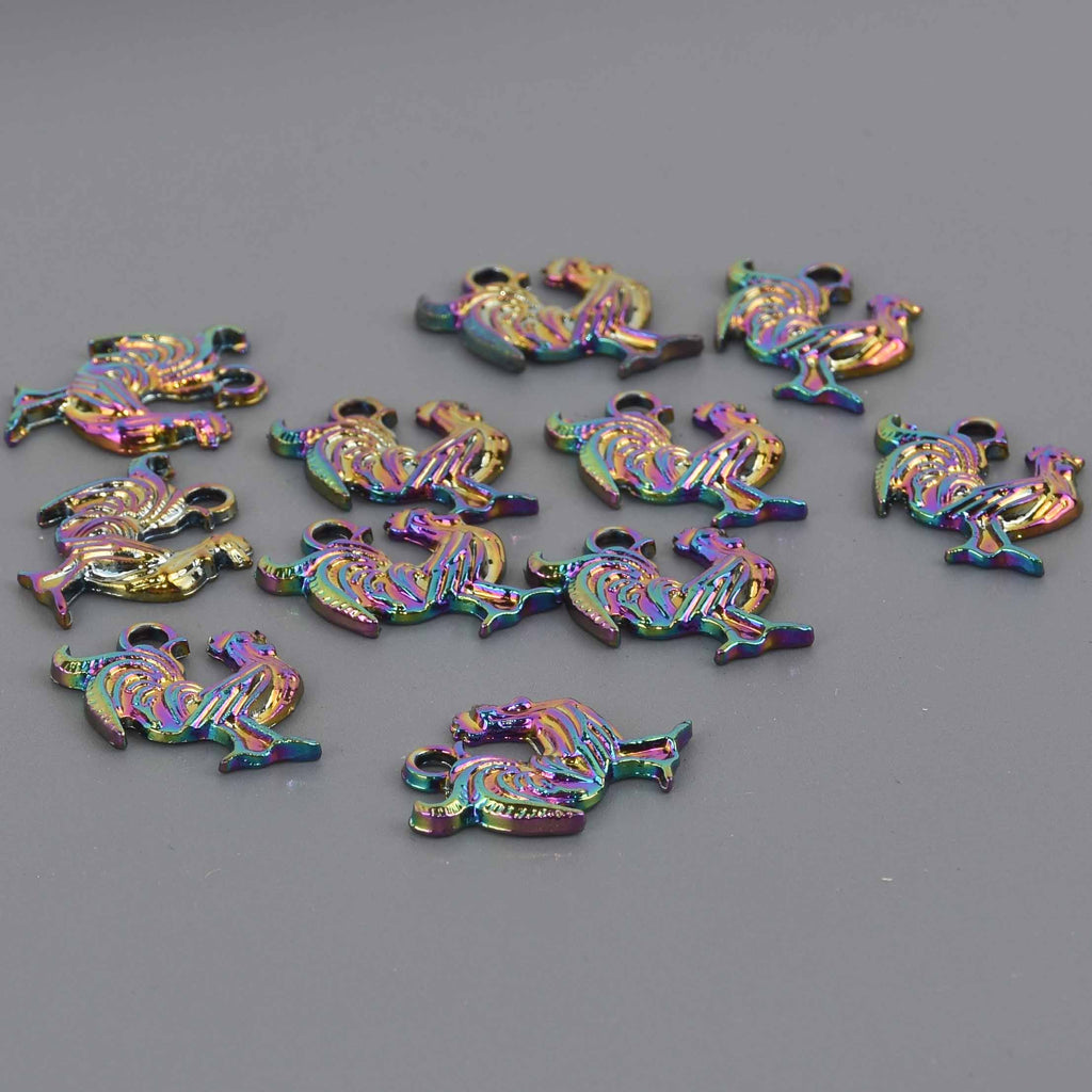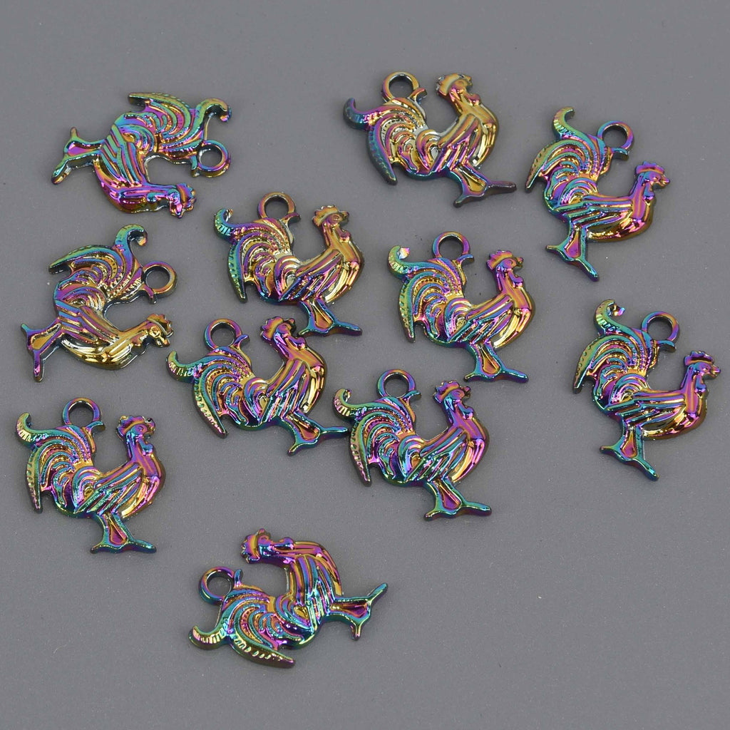 4 Rooster Charms, Rainbow Patina Hammered Metal, chs8578